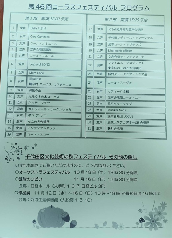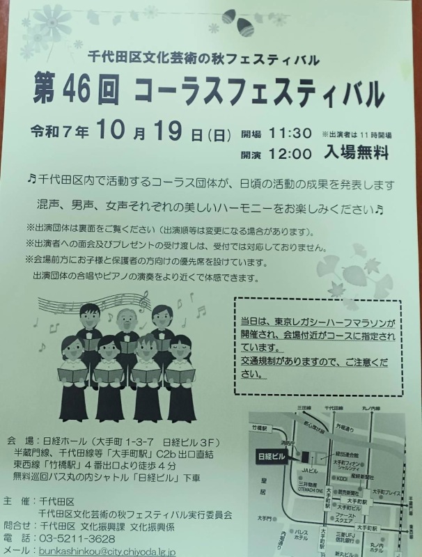 千代田区文化芸術の秋フェスティバルのコーラスフェスティバルが10月19日に日経ホールで入場無料で開催されます。コーラスフェスティバルでは以前から開会の時に区歌を歌ってきました。 何年か前から公募で区歌をステージで歌う人を募集しています。 今年は10名以上の人が参加を申し出てくださって九月から麹町小学校で練習を重ねています。今日見学に行ってきました。 指導してくださるのは部門長の安田郁子さんと委員の志摩さおりさんです。 今日は男性3名女性10名幼稚園の年長さんから70代まで! ただ区歌を歌うだけでなく、作者のことなどもレクチャーされ、歌も本格的です。 志摩さんの楽しい指導に引き込まれて、皆さんどんどんいい声になっていきました。 声が合うことの素晴らしさを体験されていました。 千代田区歌は歌えば歌うほど良さがわかります。 今年はついに18日のオーケストラフェスティバルでもオーケストラをバックに歌います。 たくさんの方に歌って欲しい素晴らしい区歌です。