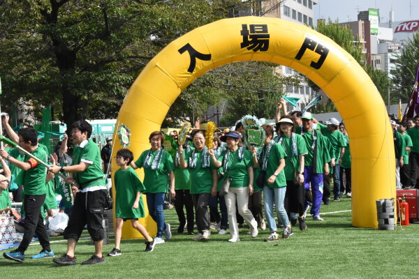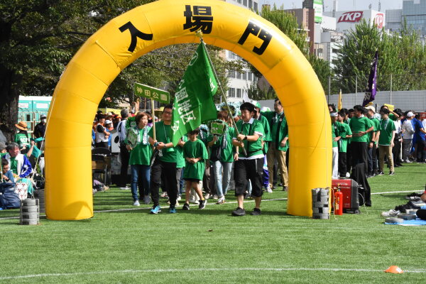 神田公園地区は、応援旗や手拭い、お手製の応援うちわを掲げて入場です。