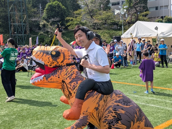 スタートのピストルを鳴らすのは、ティラノサウルスを乗りこなした樋󠄀口区長です。